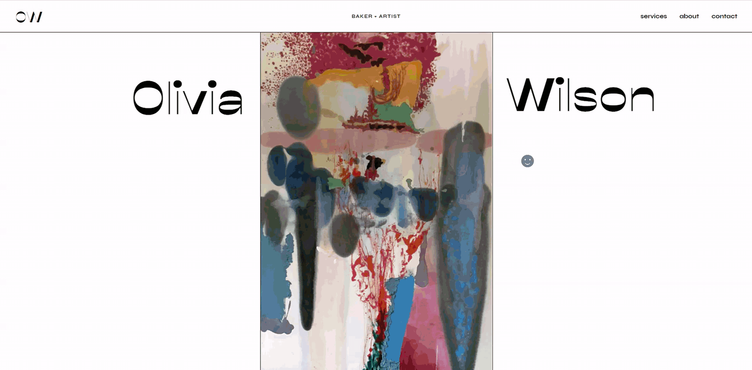 For Olivia Wilson's website, we created a fun yet minimalist design that features colors inspired by her paintings. We incorporated animated typography and a custom smiley cursor to enhance the user experience. In addition to showcasing Olivia's consulting services, the website includes a small shop for her paintings and a specialized form for ordering custom cakes.
